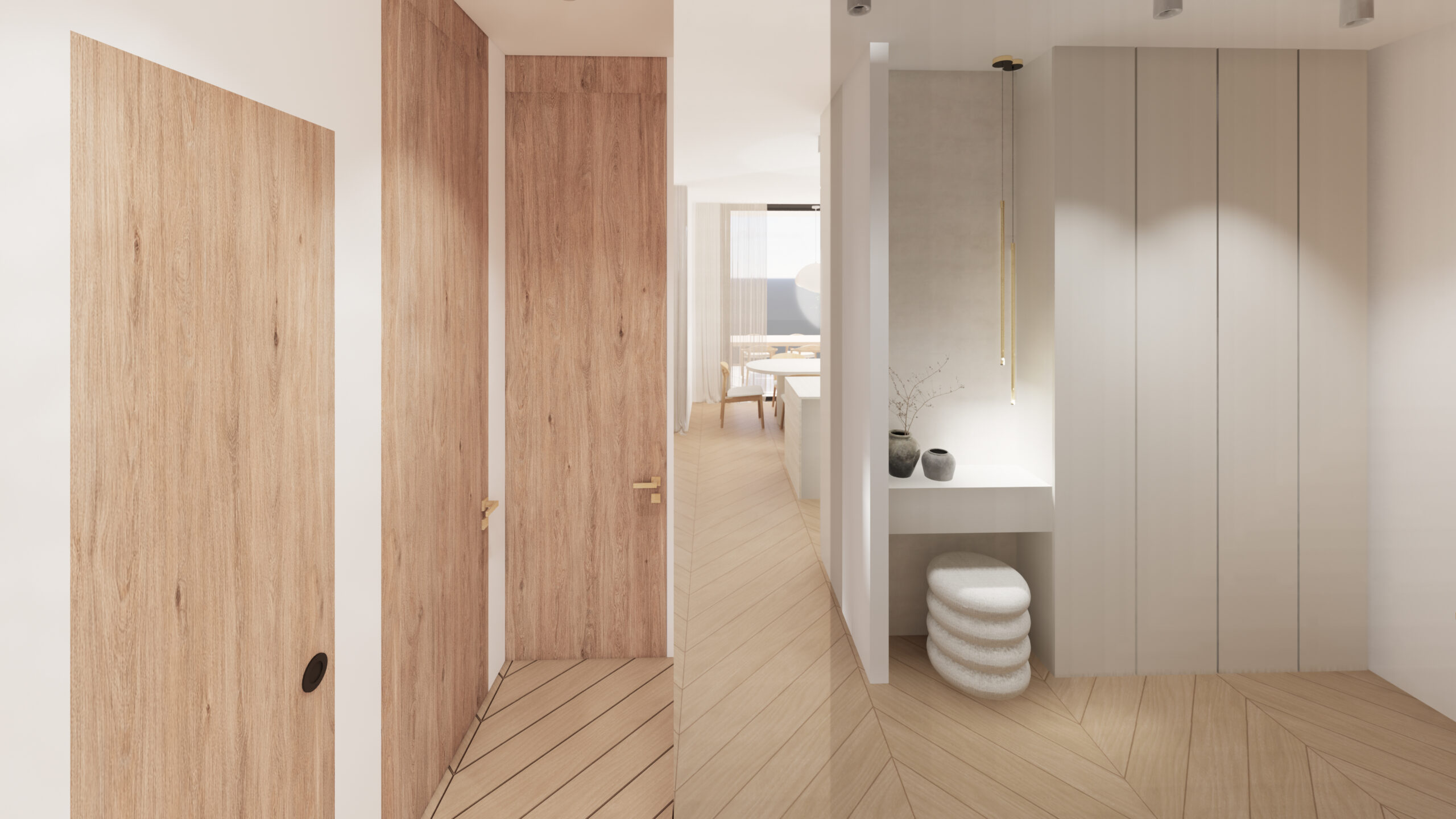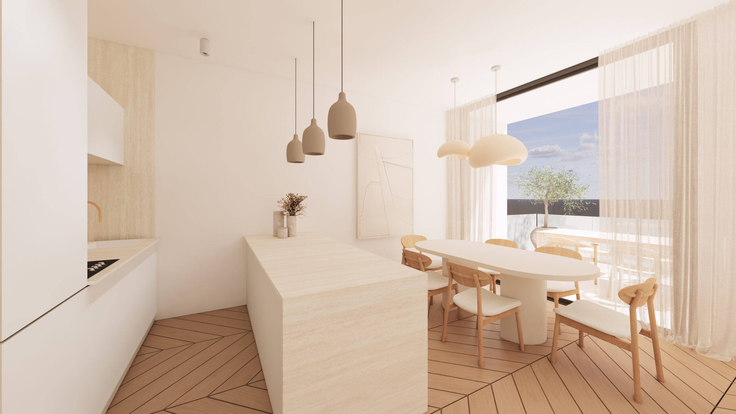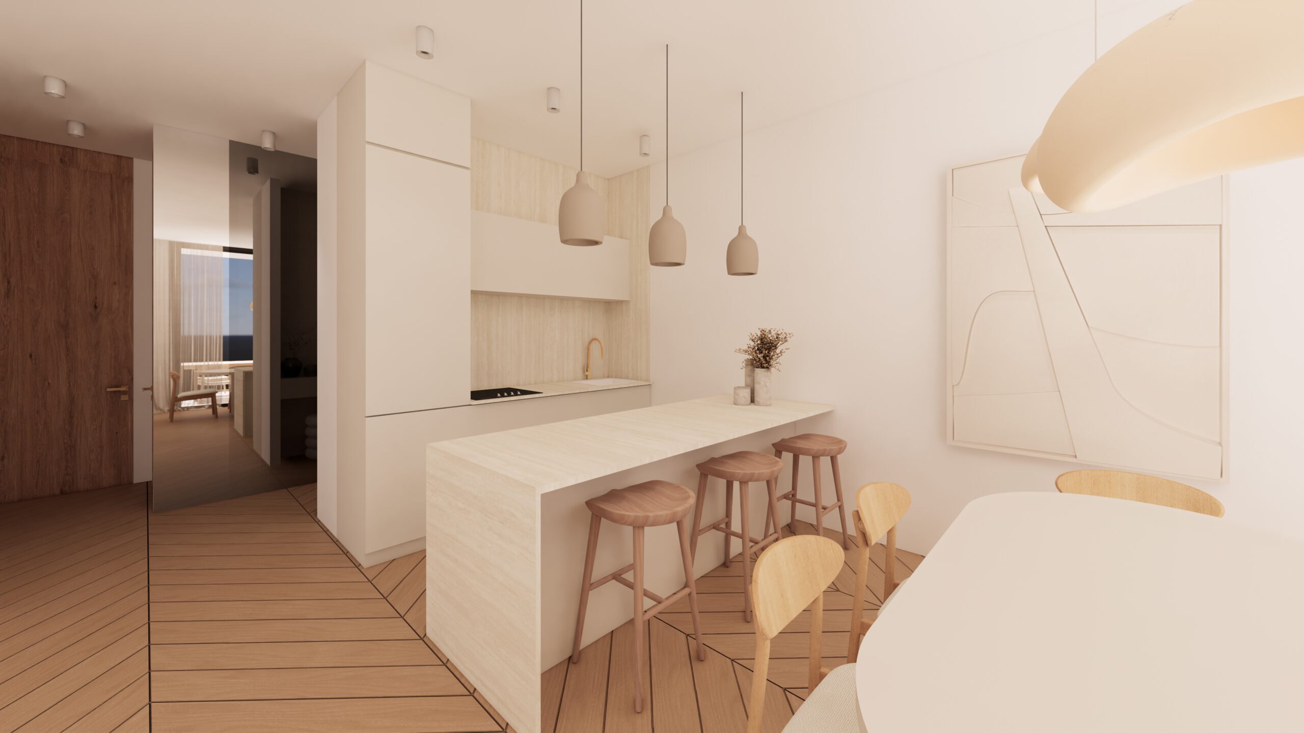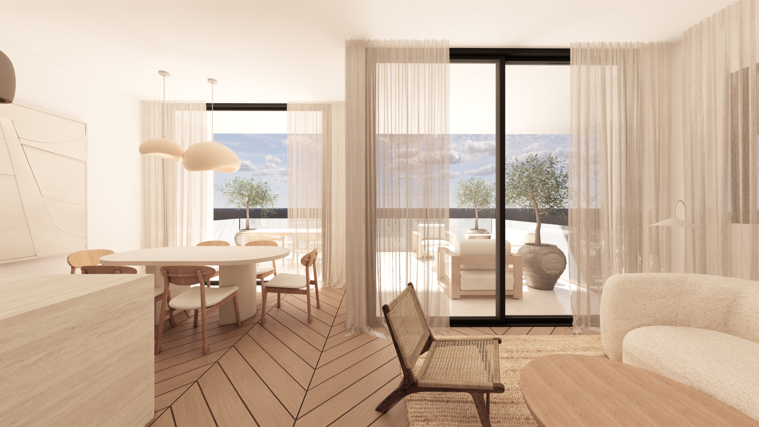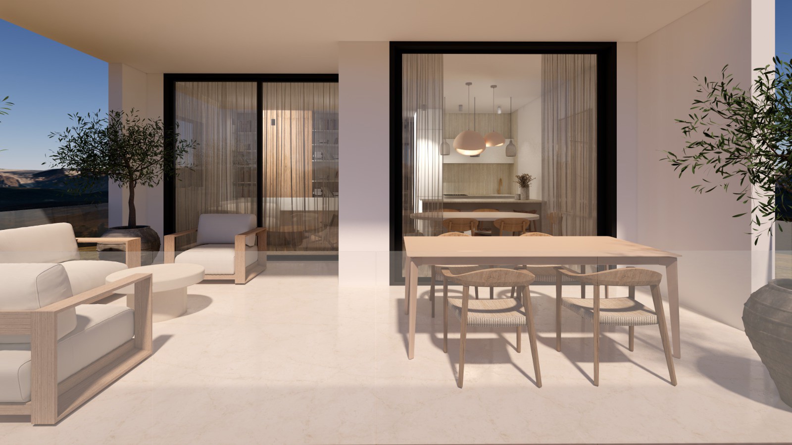 Auf das Meer ausgerichtet, eröffnet das Apartment aus jedem Winkel des Wohn- und Essbereichs einen freien Blick auf die Weite des Meeres. Die drei (!) Terrassen schaffen vielfältige Rückzugsmöglichkeiten und laden dazu ein, bei schönem Wetter entspannt im Freien zu verweilen.
